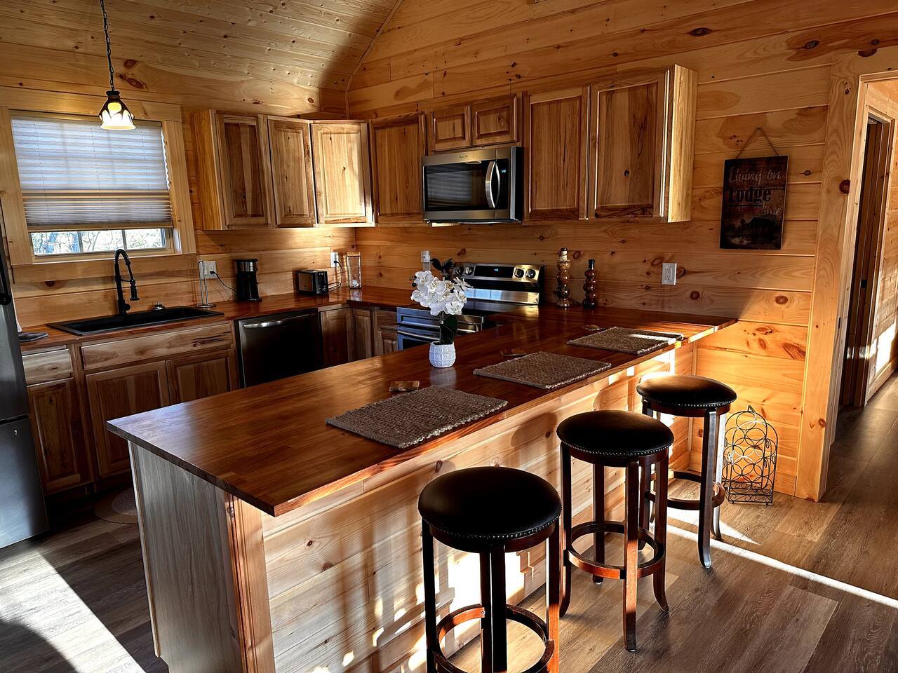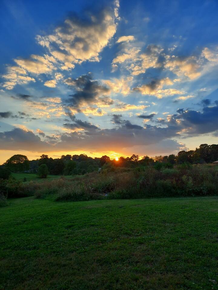Kick back and relax in this brand new, peaceful, stylish cabin which is located in the heart of Jonesborough, the oldest town in Tennessee. Sit in the rockers on the covered porch of this cabin and enjoy the surrounding views and sounds of nature. Sunsets are especially beautiful. You will lose sense of time and the hectic world around you. Many good restaurants are close by and there is plenty of nature to explore in the area.